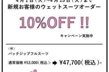 4月1日(火)〜4月15日(火)までの期間、新規のお客様に向けたウェットスーツオーダー10%OFFキャンペーンを実施しています。 ¥53,000-のフルスーツが10%OFFで¥47,700-など、元々直販価 … 続きを読む 4月1日(火)〜新規オーダー10%OFFキャンペーン